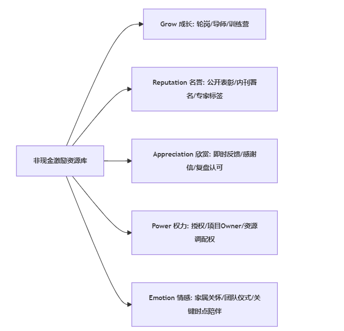 - 非现金薪酬用来强化“长期能力与身份认同”(专家成长、骨干稳定、组织文化)。