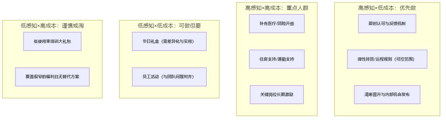 福利项目选择,建议用“企业成本(高/低)”与“员工感知(强/弱)”做决策。Mermaid不稳定支持坐标象限时,我们用可渲染的分区流程图表达同一信息。