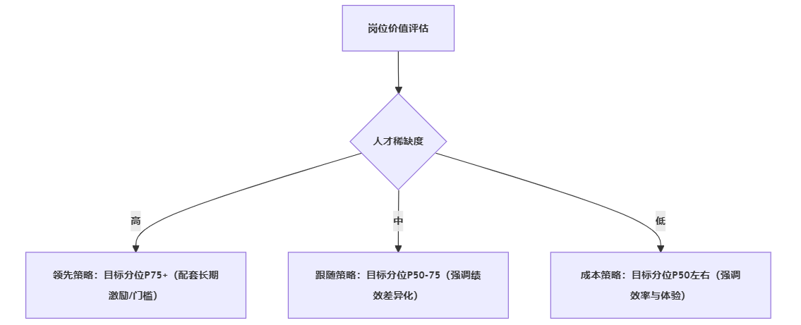 - 高价值×低稀缺:管理岗位、成熟业务骨干——多采用跟随型(P50–P75),重点在绩效差异化与内部公平。