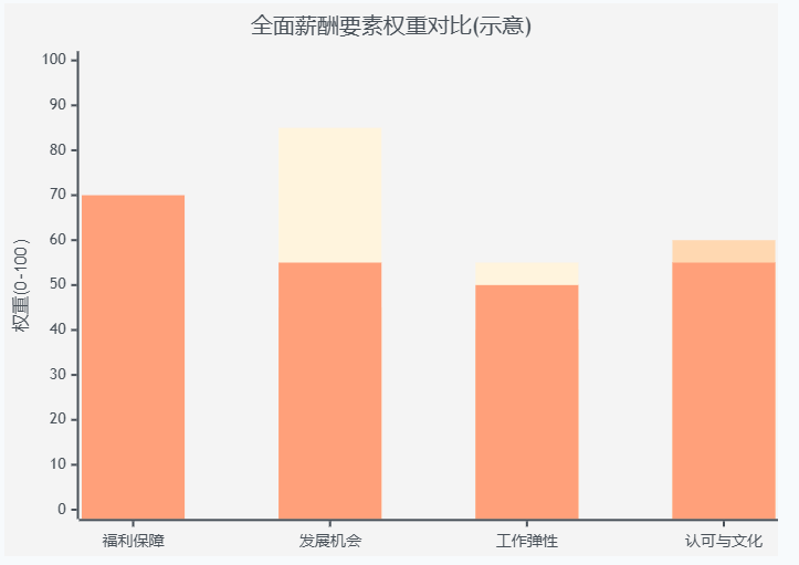 由于雷达图在部分Mermaid环境不稳定,本文用可渲染的条形图表达“不同岗位对非现金要素的权重差异”,用于辅助全面薪酬讨论。