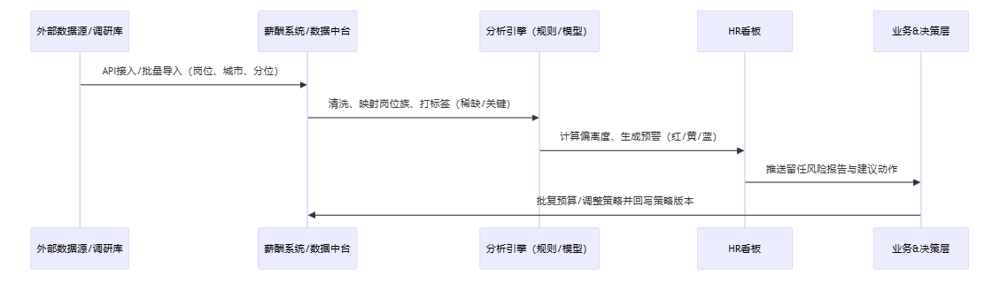 如果对标仍靠Excel和年度调研,通常只能解释过去,无法干预未来。更可行的路径是:用薪酬云平台/第三方数据接口做持续采集,用规则或模型做偏离度计算,再把结果推送到“留任风险评估”。