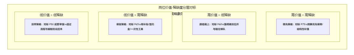 1)不同象限的目标分位(P50/P60/P65/P75);2)对应的口径(更看现金还是总薪酬);3)允许使用的工具箱(一次性、津贴、长期激励、晋升调薪)。提醒一句:如果企业只改分位、不改工具箱,最后常常还是“用固定工资硬顶”,成本上升但激励效率不升。