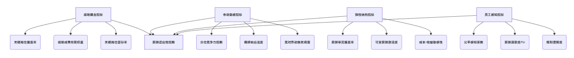 要让薪酬从“年度工程”转为“可迭代系统”,指标设计必须同时覆盖战略耦合、市场敏感、结构弹性与员工感知四个方向;这四类指标相互牵制,任何一类单独优化,都可能带来副作用(例如只追市场分位会推高成本,只追内部公平会降低外部竞争力)。