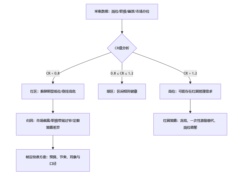 边界条件:CR的目标值选择会影响判断。若企业定位“略低于市场P50”,CR的目标中位值就不应等同于市场中位数;否则会把战略性低位误诊为风险。仪表盘应服务于薪酬战略,而不是反过来绑架战略。