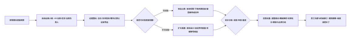 - 处置思路:以纠偏为主,包括书面提醒、合规培训、要求删除/撤回、签署补充承诺;必要时对涉密岗位进行短期权限收敛。