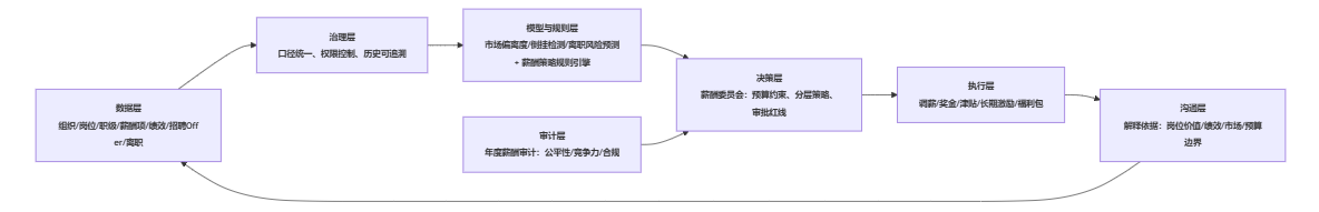 | 长期预防 | 可迭代、可预警、可审计 | 动态调薪模型、BI看板、年度审计 | 数据治理、薪酬委员会、审计机制 | 黑箱化、指标游戏化 | 规则先行、模型辅助;审计追溯;指标口径固化与透明 |