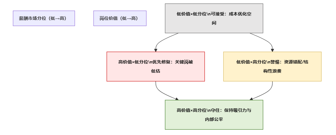 图表2:岗位价值—薪酬分位四象限示意(Mermaid替代散点图)