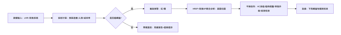 有效做法是把预算从“数字”改成“规则”:设置预警阈值(例如按月/季度的红橙黄绿区间),并明确每一档对应动作——冻结非必要HC、暂停普调、关键岗位单独审批、或启动组织效率评审。边界条件也要写清:如果业务出现重大机会窗口(大客户、政策红利),允许在“人效不下降、毛利不恶化”的条件下启用预算弹性。