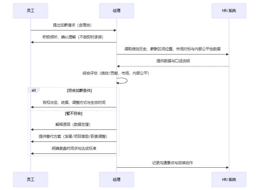| 员工要求加薪 | 情绪化、保留风险、越权承诺风险 | 三步走:倾听确认→三维评估→给选择;替代方案;记录追踪 | Compa-Ratio/区间位置;市场对标;沟通记录模板 |