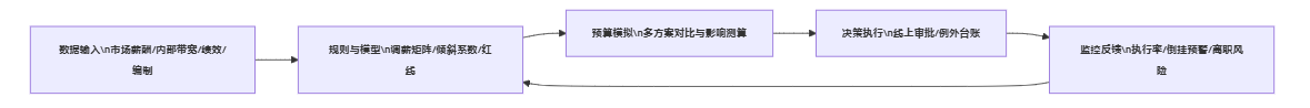 - 数据输入:市场对标数据、内部薪酬分布、绩效结果、人员编制与流动预测