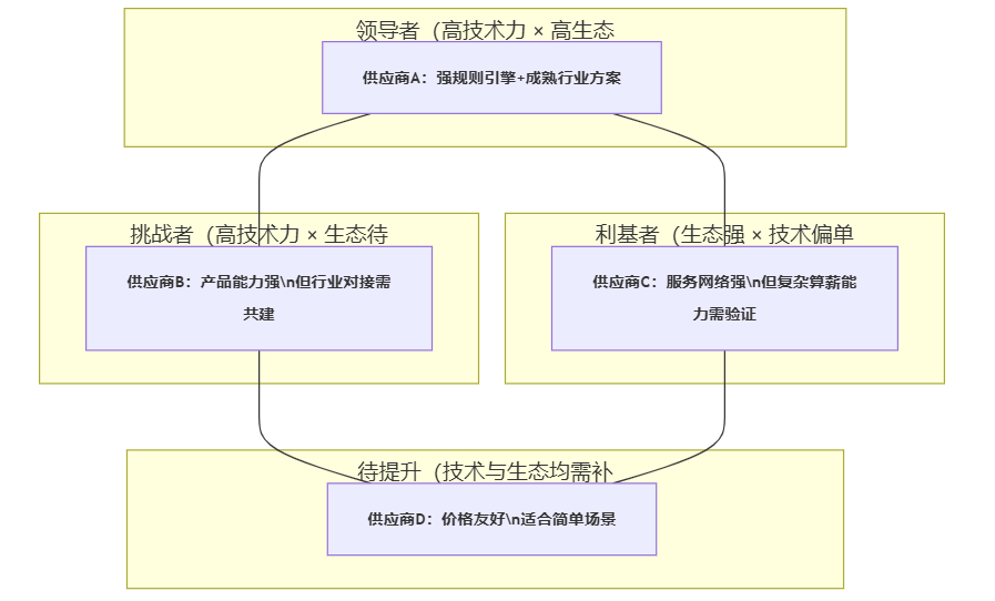 为避免象限图在Mermaid环境不稳定,我们用可渲染的分组流程图表达同一信息(领导者/挑战者/利基者/待提升),并用“供应商A/B/C”保持中立。