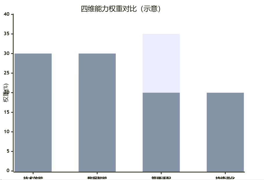 在四维评估框架下,我们通常还会建议企业做“权重动态调整”:跨国或多法人企业往往更重合规与数据隔离;高速增长的科技企业更重实时对标与情景模拟。为了便于讨论,我们用可渲染的柱状图替代不稳定的雷达图来表达权重差异。