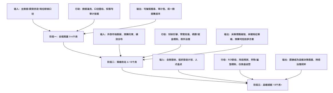 薪酬分析系统的ROI,往往不来自“上线那天”,而来自上线后的运营。我们建议用三阶段路线实现从合规到战略赋能的价值跃迁:先把数据与口径做实,再把对标与预算做快,最后把预测与业务指标做深。