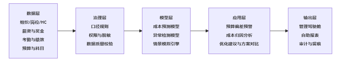 - 分析层:人力成本结构分析、单位成本(人均/人效)分析、组织/岗位/项目维度归因、情景模拟(调薪/组织调整/用工替换)。
