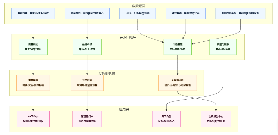 - 数据线:梳理薪资项字典、岗位与职级映射、绩效字段与校准记录;建立异常规则(带宽外、同岗差异过大、关键字段缺失),让系统上线即具备基本的质量门槛。