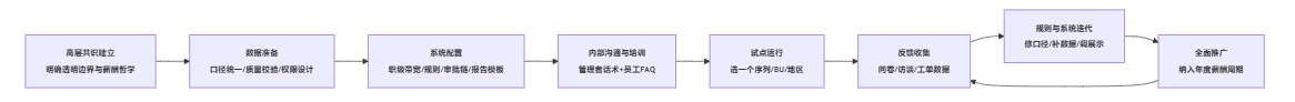 - 用试点验证“理解度”而非只验证“功能”:试点考核加入员工理解度问卷、管理者解释一致性、例外审批比例等指标。