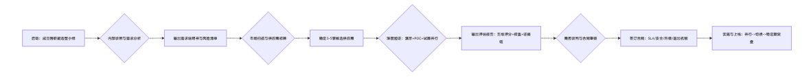 | 4. 商务与合规谈判 | SLA、数据安全条款、升级策略、回滚机制、退出机制 | 采购/法务/CIO | 《合同条款清单与风险评审意见》 |