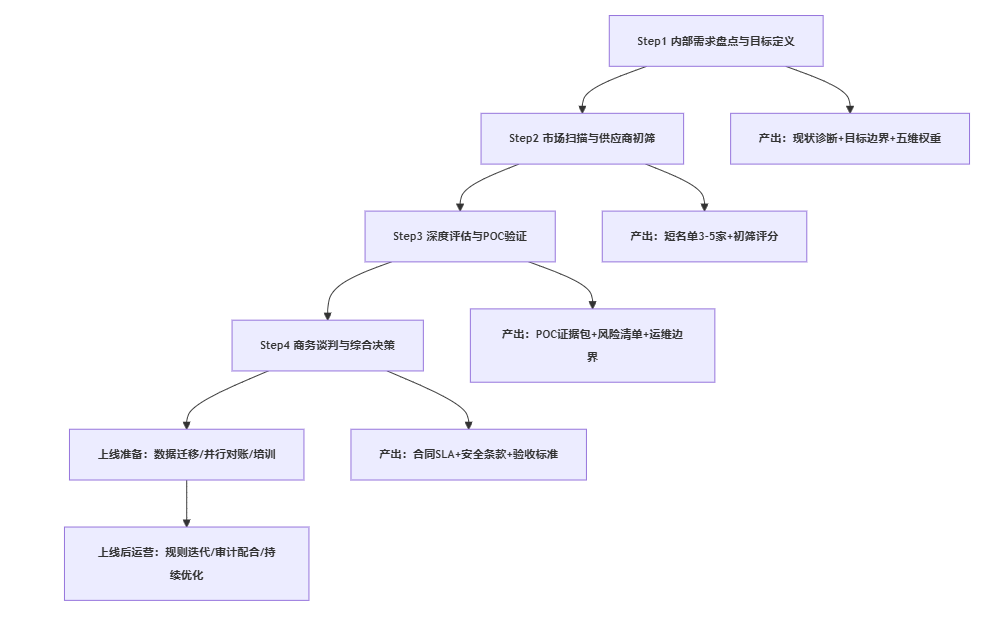 选型不是“挑一个产品”,而是一次跨部门对齐与风险管理过程。四步法的关键价值在于:把口水仗变成证据链,把偏好变成可验收的标准,把“上线”变成“可持续运营”。