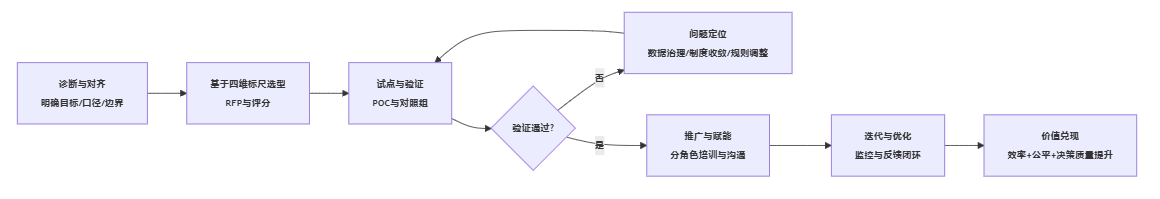 | 试点与验证 | POC验证数据、流程、模型与解释 | 试点评估报告、问题清单 | 数据可用率达标、建议可解释、流程闭环 |