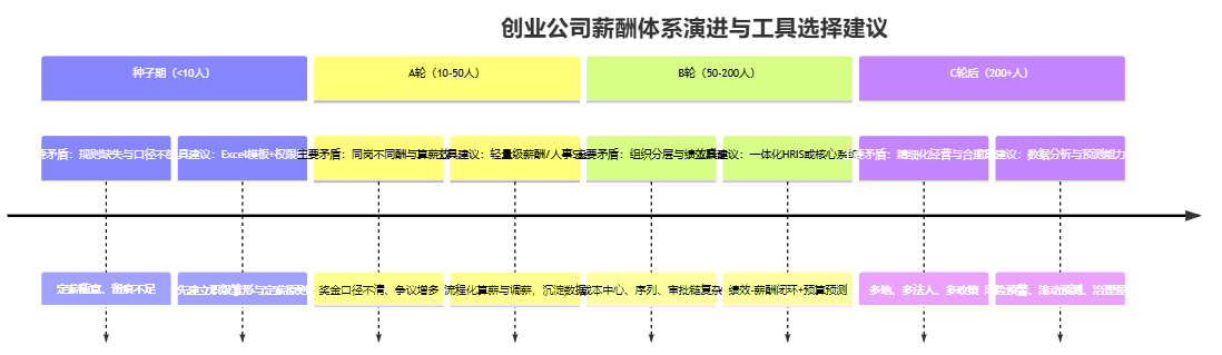 图表3:创业公司从种子轮到规模化的薪酬工具演进(Mermaid时间轴)