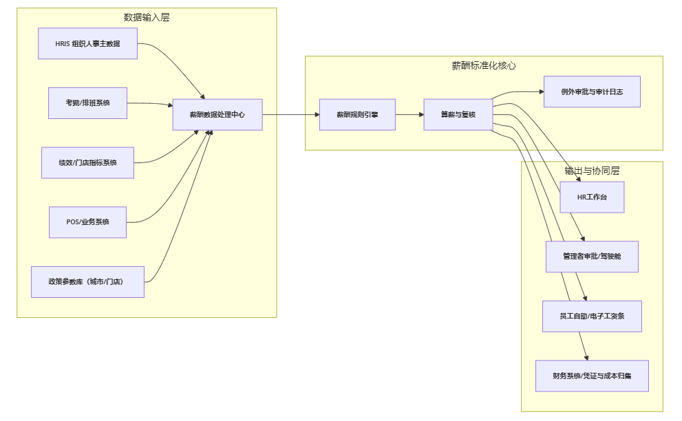 这一架构图想表达的关键点是:连锁企业并不缺“算薪动作”,缺的是一套稳定的数据管道与规则引擎,把数据输入、规则计算、例外审批、输出对账做成闭环。