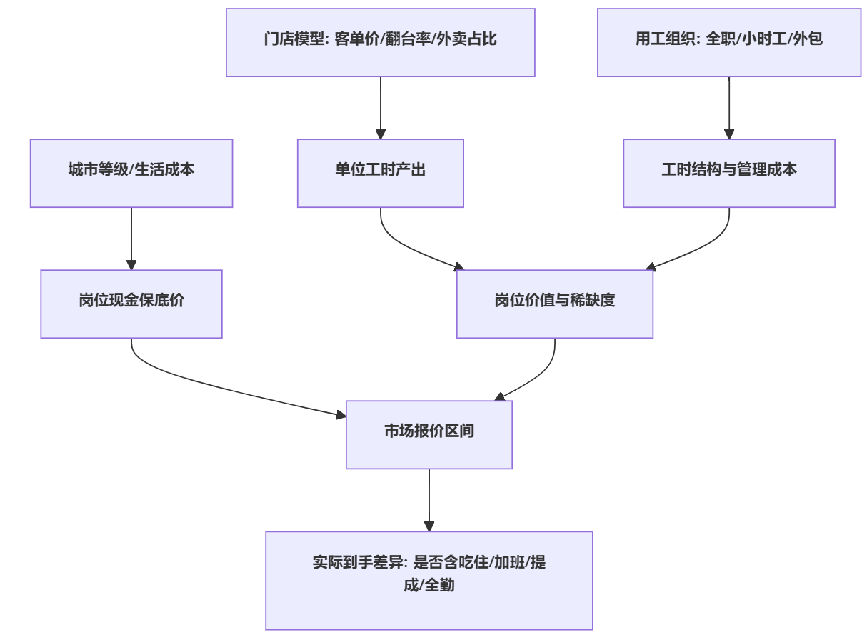 1. 餐饮薪酬的三类驱动:城市成本、客单价/翻台率、用工组织(全职/小时工/外包)