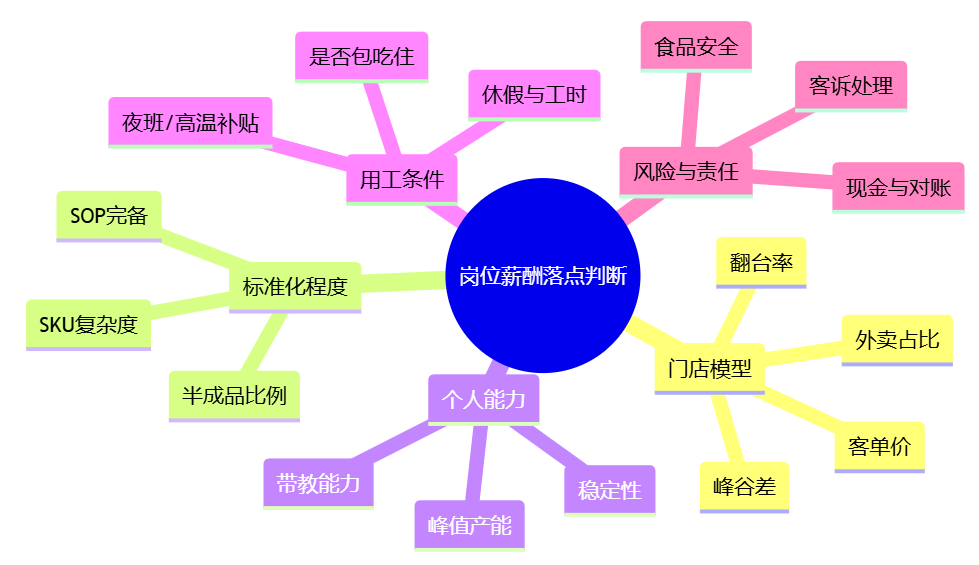 后厨与管理岗的薪酬差异更“结构化”:技术稀缺度、出品稳定性、食品安全风险、以及是否能用SOP替代,直接决定了上限。可以把它理解为:前场更像“人力密度”的竞争,后厨更像“产能与质量”的竞争(这是本模块唯一的类比)。