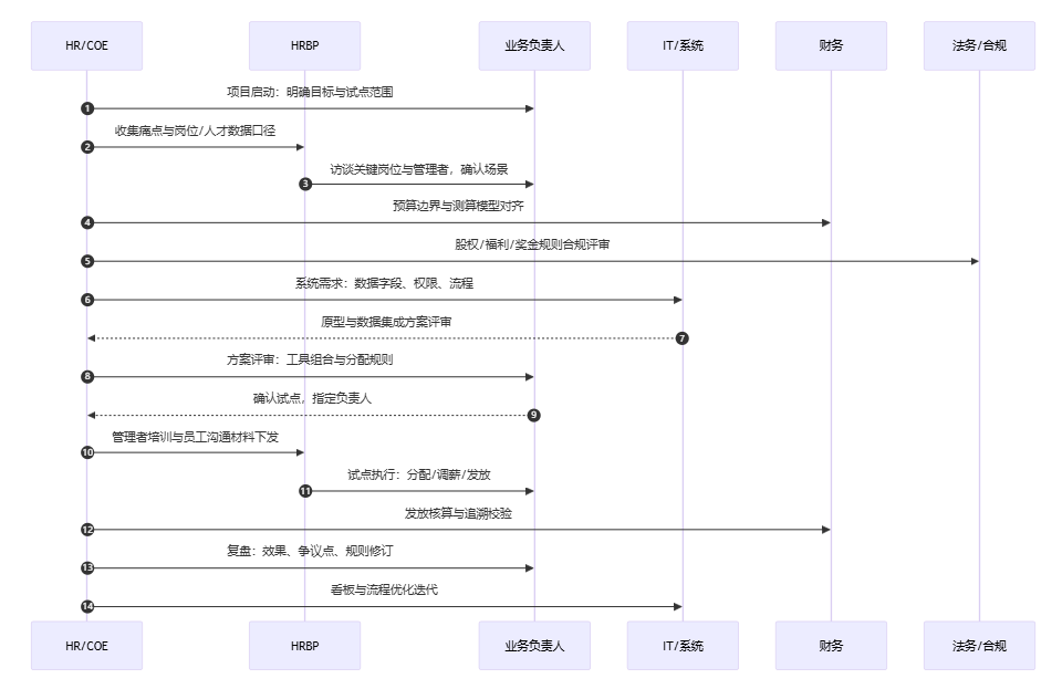 | 试点 | 明确规则、口径、预算边界;选试点团队;完成一次发放/调薪闭环 | 试点方案、预算测算、沟通材料、复盘报告 | HR+业务负责人 | 1-2个周期 |
