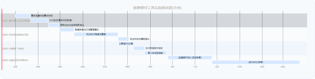 薪酬顾问工具的成败,往往不取决于“选了哪家”,而取决于能否用正确的节奏把它嵌入交付流程、培训体系与数据治理。我们的建议是把落地当作一次“交付体系升级”,而不是一次系统上线。