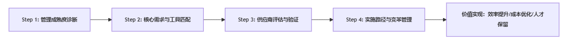 我们在项目实践中看到,很多企业选型失败是因为跳过诊断:一上来就想要AI预测,但基础数据还靠手工补;或只上发薪模块,却希望解决人效问题。诊断建议从四个问题入手: