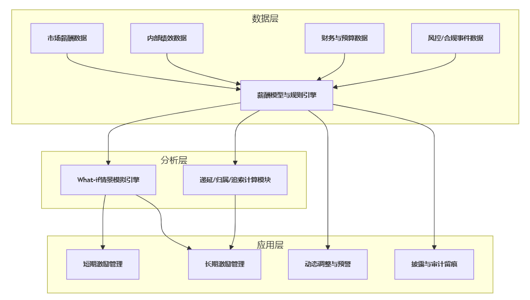 下面用一张结构图描述“新一代数字化高管薪酬激励平台”的基本架构,便于和IT/财务一起对齐建设范围。
