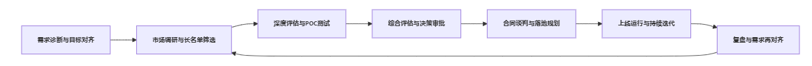 | 综合评估与决策审批 | 加权评分、成本测算、风险预案、审批材料 | 选型报告、审批通过文件 | 评分主观、材料不闭环 | 四维适配证据化;一票否决项前置 |