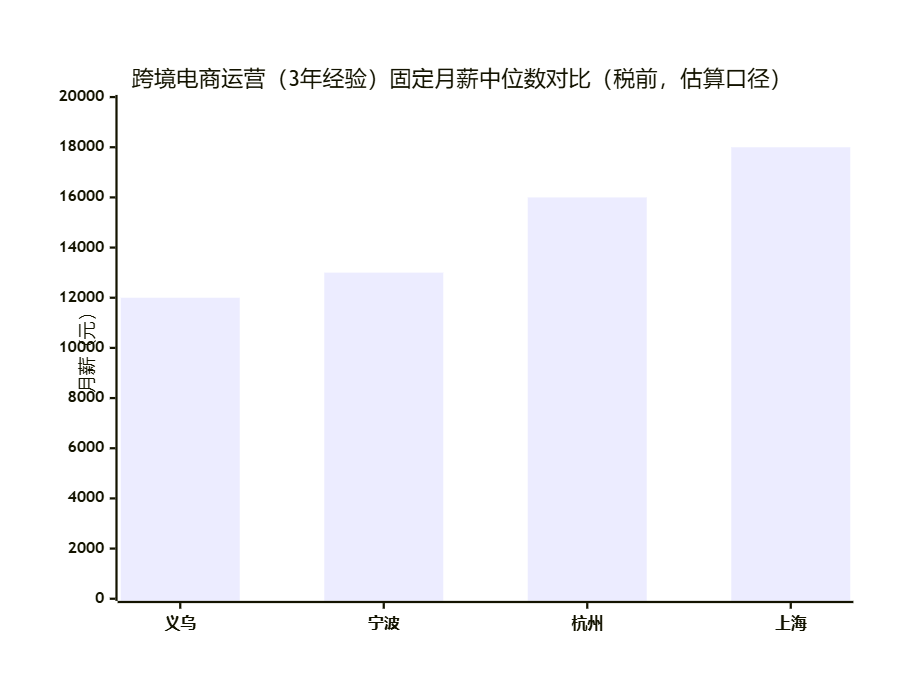 下面的对标图以“跨境电商运营(约3年经验)固定月薪中位水平(不含提成)”作为锚点,用于直观比较城市间的定薪差异。该指标适用于“岗位名称相近、职责边界相对清晰”的企业;若是“运营兼选品/兼客服/兼仓配”,固定薪资可能更低但提成更高,不能直接对照。