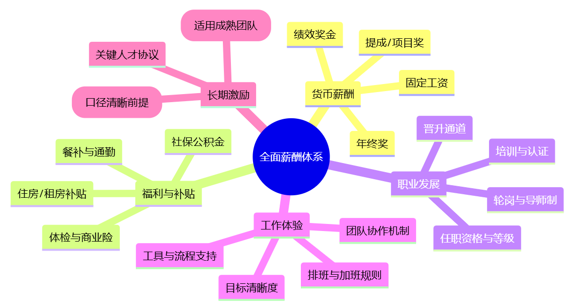 为了让“全面薪酬”更可视化,我们用思维导图把它拆成可执行的构件。企业可以先从其中2—3个分支起步(例如货币薪酬+福利补贴+职业发展),逐步迭代,而不是一次性全做。