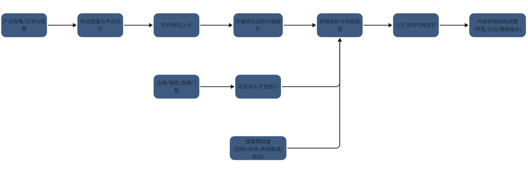 | 市场需求 | 大项目节点、新赛道(商业航天/无人系统)、交付压力 | 关键节点溢价,短期“抢人”推高报价 | 总体/控制/软件/系统 | 需求回落时,固定薪酬过高会反噬成本 |