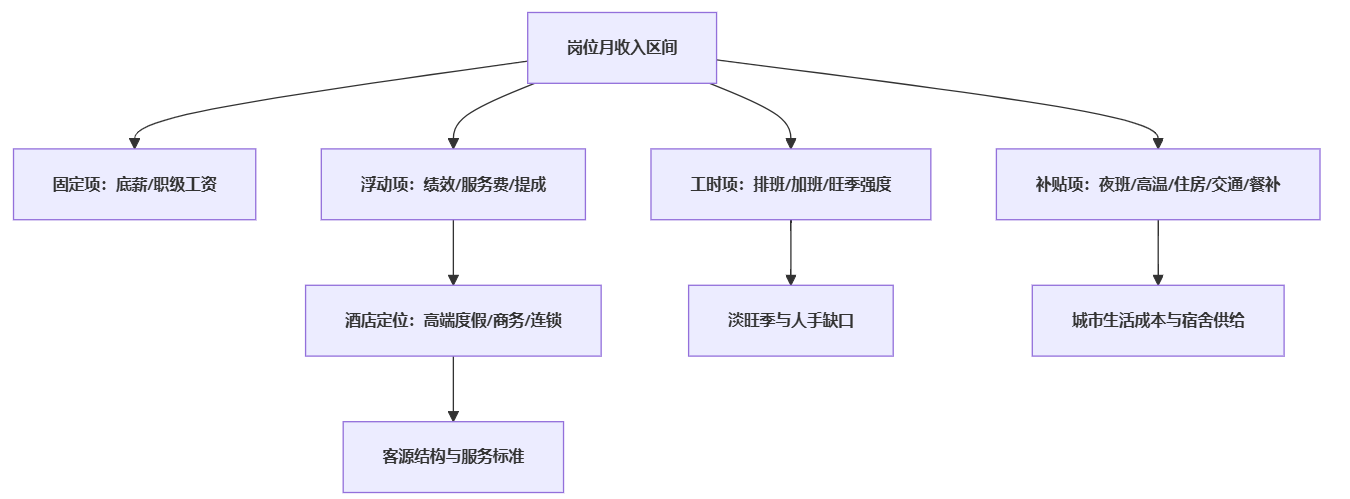 | 客房服务员(基层) | 3,500–5,800 | 10%–30% | 计件/房量、排班工时、住宿与通勤成本 |