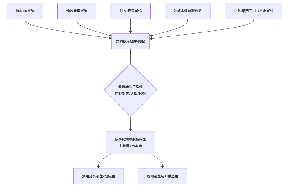 薪酬分析的难点往往不在“算分位”这种计算本身,而在“到底用哪张表、哪套口径、哪条时间线”。一体化数据底座解决的就是三件事:打通、对齐、可追溯。