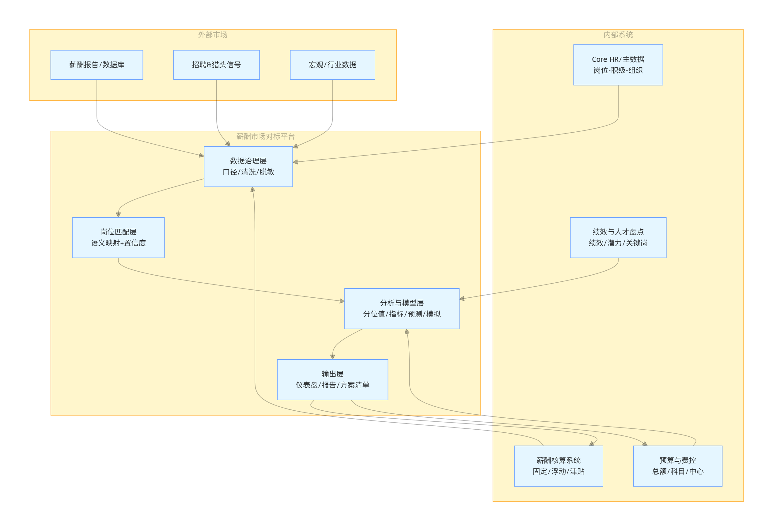 | 年度调薪 | 分析引擎 + 情景模拟 + 报告 | 预算约束下的分位值目标与覆盖策略 | 调薪方案、成本测算、名单与沟通材料 |