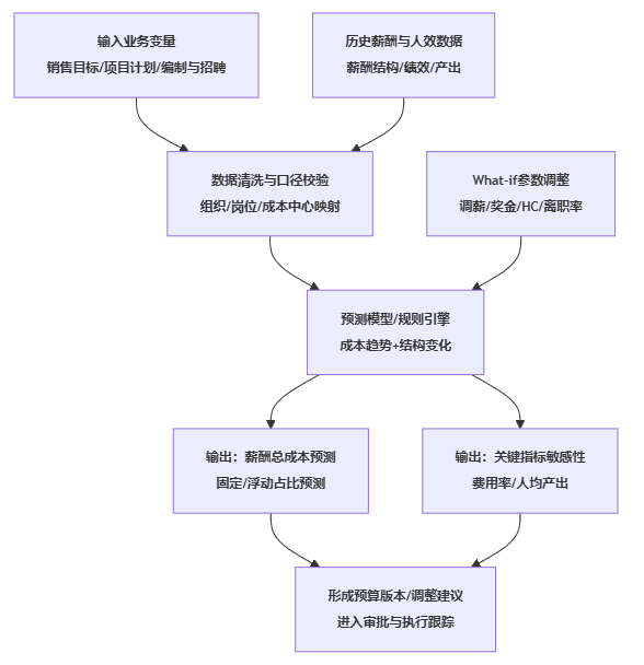 - 输出可落地:输出至少要覆盖总成本预测、固定/浮动结构变化、部门/项目分摊变化,以及对关键经营指标的敏感性(比如薪酬费用率上升0.5个百分点意味着什么)。