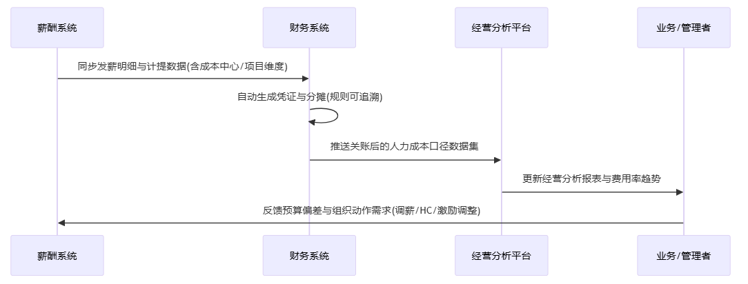 业财一体化不是把HR数据丢给财务,而是把“薪酬发生—计提—分摊—入账—经营分析”连成一条可追溯链路。许多企业的现实困境是:HR系统算的是发薪口径,财务关账用的是计提口径,部门看的是成本中心口径,项目看的是项目归集口径——同一个月的“薪酬成本”出现三四个数字,导致管理讨论无法收敛。