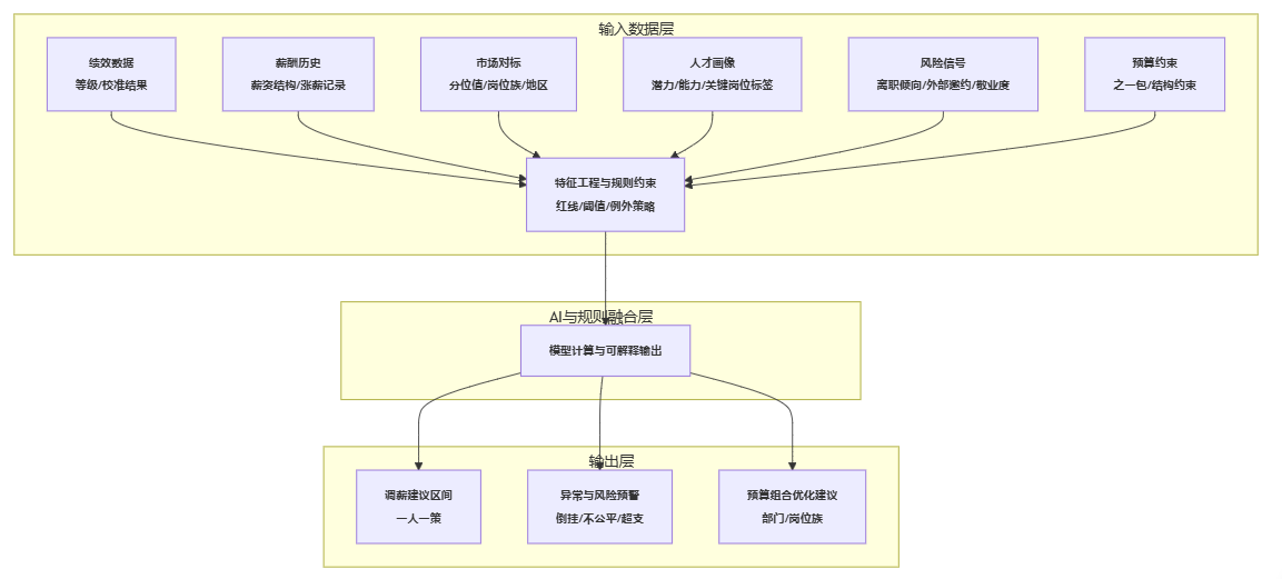AI在调薪场景的合理定位,是决策支持而非决策替代。实践中,管理者最难的是把多维因素同时纳入:绩效、能力潜力、市场稀缺性、关键岗位替代难度、内部薪酬公平、离职风险与预算约束。AI的价值在于把这些维度转成可计算的权重与建议区间,并把异常点显性化。