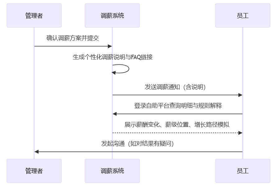 图表3给出调薪确认后从管理者到员工的沟通时序,关键在于系统把“解释动作”标准化,从而降低管理者口径不一致的风险。