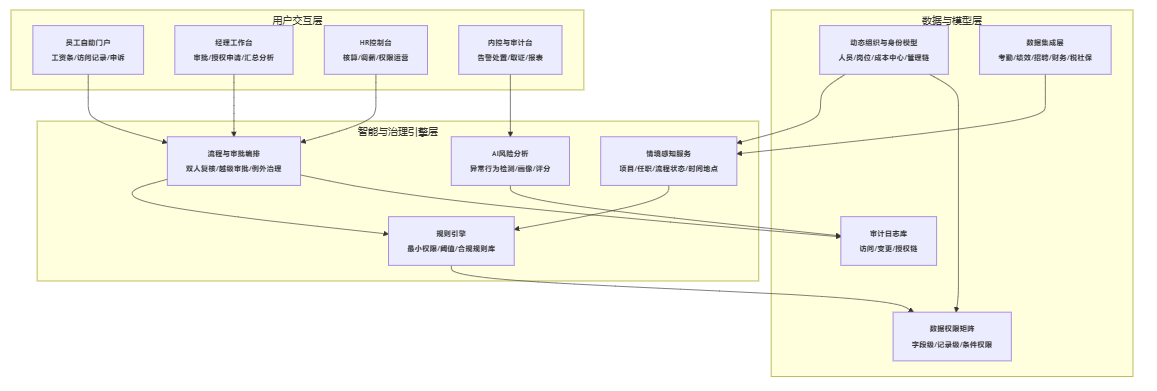 - 关键操作跨模块联动(例如调薪审批通过后,薪酬系统自动获得必要的临时编辑权限,并在生效后回收)。