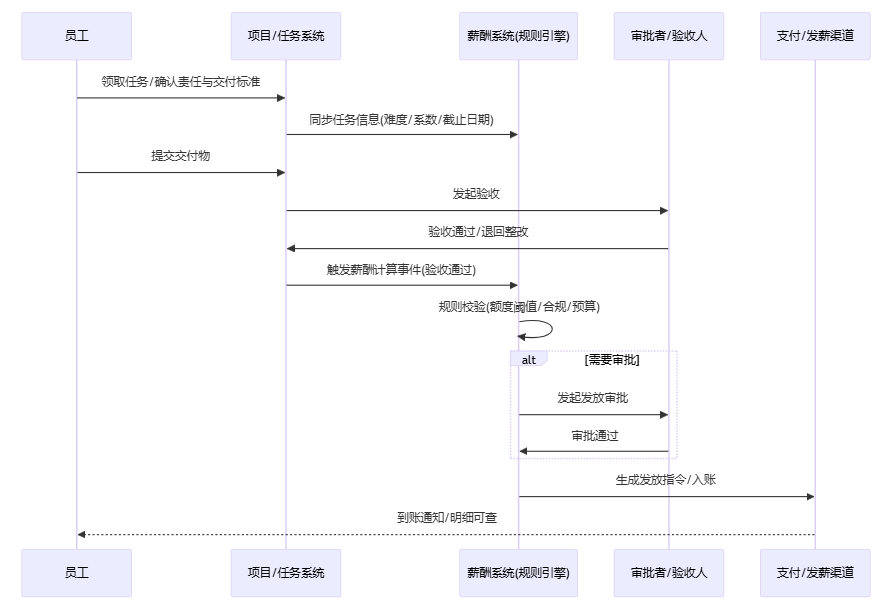 - 任务付薪:把核算颗粒度进一步下沉到项目/任务层面,按任务完成度、难度系数、时效与风险等级结算。