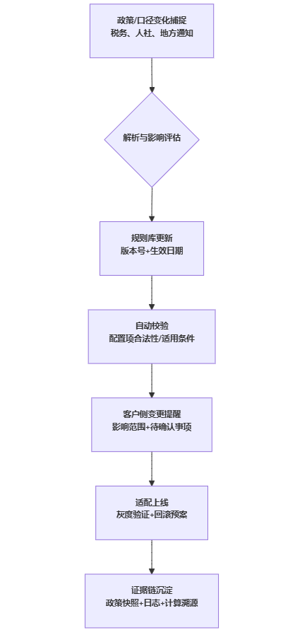 - 更新频率错配:服务商以季度补丁、年度大版本为节奏;而个税口径、地方社保基数上下限、补贴计税规则等变化常常按月甚至按通知即时生效。