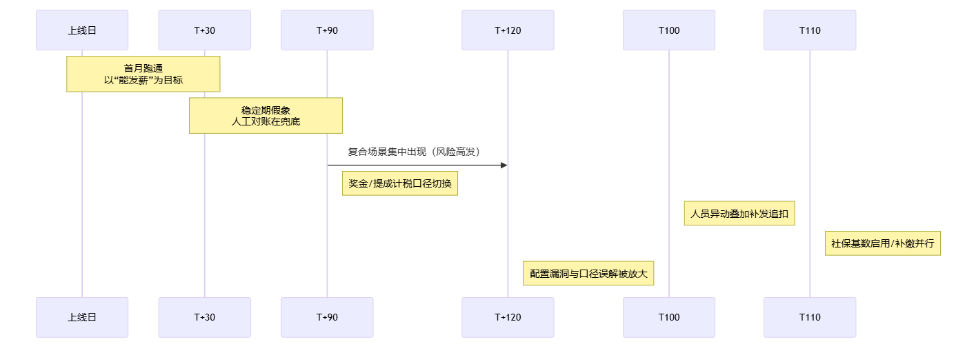 很多团队的“首次稳定期”发生在1–2个发薪周期内:人员少、结构简单、奖金少、补发少。真正的压力往往在后续叠加场景出现时集中释放,例如: