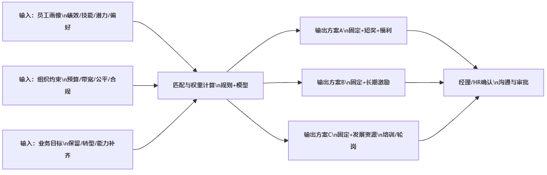 - 员工画像:技能标签、绩效轨迹、潜力评估、岗位关键度、历史薪酬变化、福利使用偏好(可选)。