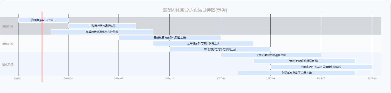 | 第二阶段:赋能 | 部署三大必备模块 | 智能核算、公平审计、市场对标与模拟进入常态运营 | 9–12个月 |