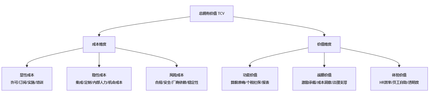 大型企业要把薪酬系统选型从“买软件”升级为“投能力”,最有效的方法是建立一个能被审计、能落到表格、能做对比的统一框架。TCV模型的价值在于:它把隐性成本与隐性价值显性化,让不同路线的产品可以放到同一尺度上评估。