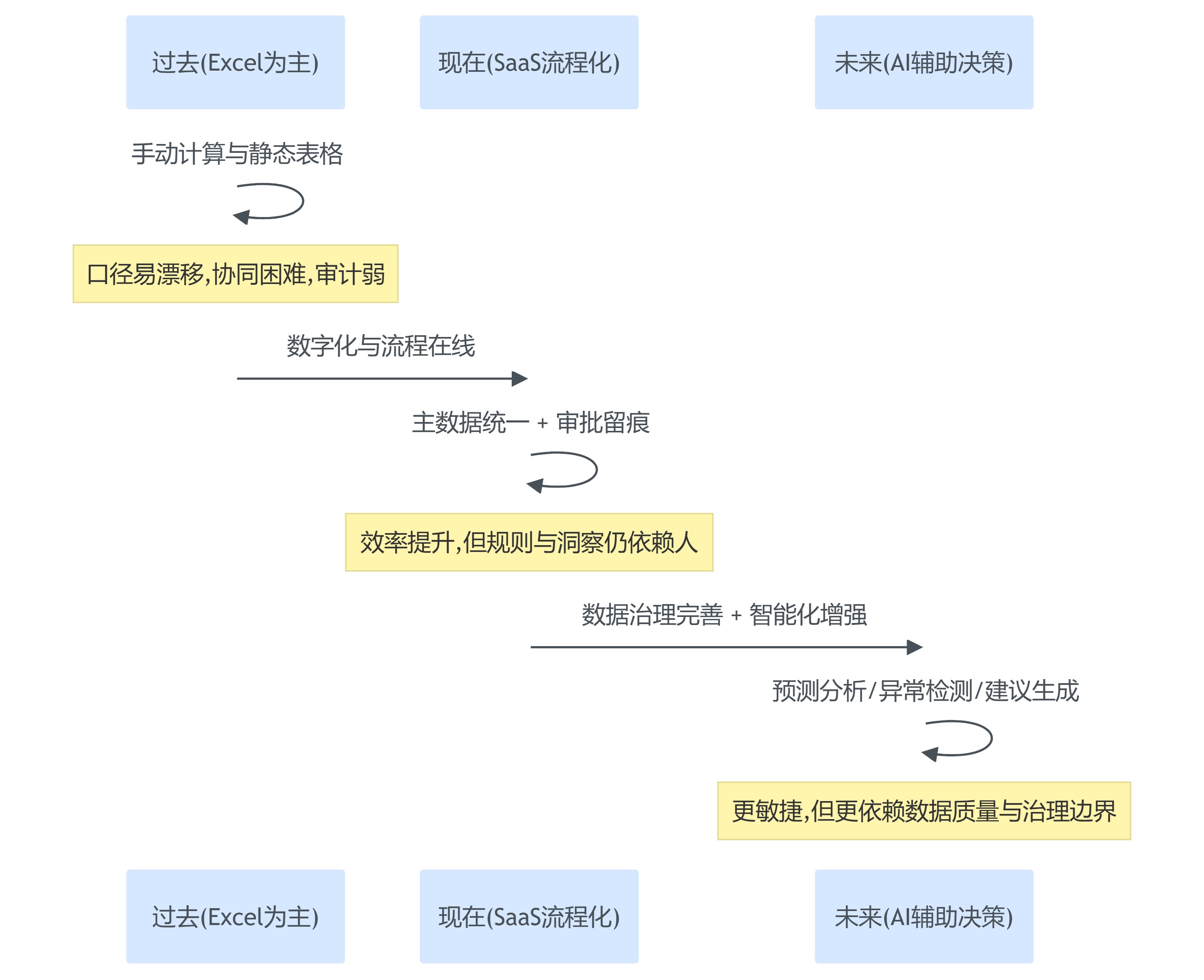 下面用一张演进时序图把能力迁移关系讲清楚:从手工表格到流程在线,再到智能辅助,变化的核心是“决策可追溯度”提升。